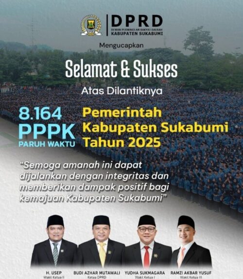 DPRD KAB Sukabumi Mengucapkan Selamat Atas Dilantikny PPPK Paruh Waktu KAB Sukabumiwarta5 Desember 20259 Desember 2025DPRD, JAWA BARAT, SUKABUMI416 views Jangan LewatkanDPRD Kab. Sukabumi Mengucapkan Selamat HAKORDIA Se-Dunia TA 2025Ketua DPRD Sukabumi Hadiri Peringatan Hari AIDS Sedunia 2025, Tekankan Edukasi Sehari-hariMengapa Wacana Penggabungan Susukecir ke Kota Sukabumi Kembali Mengemuka?Mengapa DPRD Sukabumi Turun Tangan Menyikapi Dugaan Pencemaran Tambak Udang di Cipatuguran?